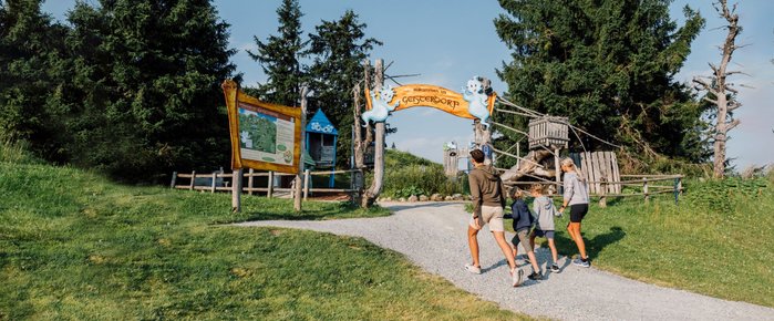 Dass im Sommer 2024 TIMOKS WILDE WELT in Fieberbrunn nicht mit der Streubödenbahn erreichbar ist, ist für fitte, abenteuerlustige Familien gar nicht so schlimm. Denn schon mit aktiven Vier- bis Fünfjährigen ist die rund einstündige leichte Wanderung, die immer wieder durch den Wald geht, gut machbar. Sie führt von den Parkplätzen Lindau 17 in Fieberbrunn über den Weg Nr. 711 und 7, den Schweinestberg Forstweg und den Weg Nr. 8 nach oben auf 1.210 m Meereshöhe. Umso größer ist die Freude bei den Kleinen, wenn sie mit einer abwechslungsreichen Abenteuerwelt zum Toben belohnt werden. In Timoks Waldseilgarten wartet ein Hindernisparcours aus Baumstämmen und Seilen in rund 1,5 Metern Höhe auf die ganze Familie. Hier sind viel Geschick, Balance und Ausdauer gefragt. Ein riesiges Hüpfkissen mit dem Namen Timoks Wackelpudding lädt zu großen Sprüngen inmitten der Bergwelt ein. Und dann gibt es auch noch Timoks Wasserspiele, Timoks Kletterpark, den digital-alpinen Rundwanderweg Timoks Museum Goes Wild, ein Damwildgehege und Timoks Alpine Coaster. Was dagegen schade ist: Der Spiele- und Lehrpfad „Timoks Entdecker Checker Pfad“, der erst 2023 eröffnet wurde, ist aufgrund der Baustelle im Jahr 2024 geschlossen. Trotzdem lohnt sich der Aufstieg für Familien mit den vielen anderen Möglichkeiten am Berg.