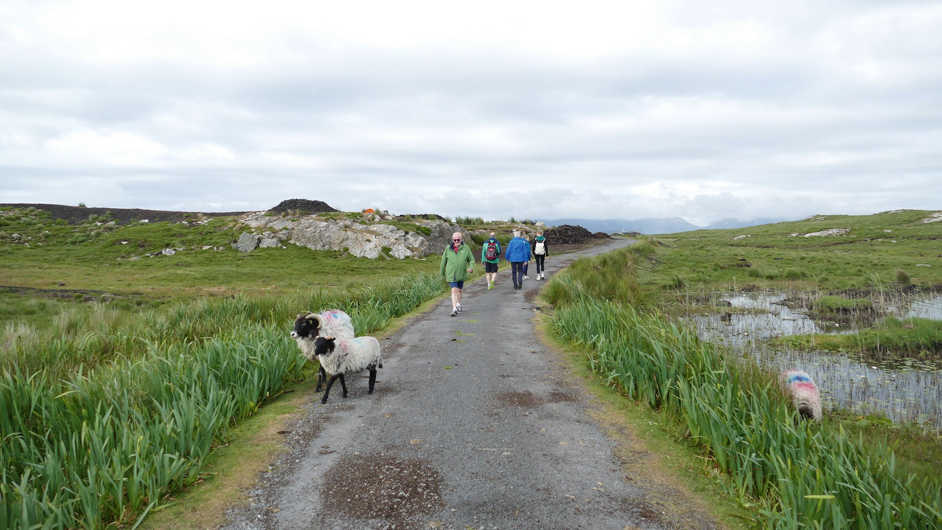 Was dagegen zunimmt, ist das Weideland mit Pferden, Kühen – und natürlich unzähligen Schafen. Häufigste Rasse in der Region ist das Schottische Schwarzgesicht, dem die Cartoon-Figur Shaun das Schaf nachempfunden ist. Es ist für das Terrain mit bis zu 700 Meter hohen Gipfeln am besten geeignet und wird hier vor allem für die Fleischproduktion gezüchtet. Neben anspruchslosen Pflanzen wie Stechginster, Wollgras und Margeriten sticht immer wieder der aufgestapelte schwarze Torf ins Auge. Er wird in mühevoller Arbeit aus der Moorlandschaft Connemaras gewonnen und ist ein wichtiges Heizmittel.