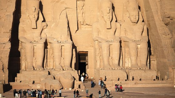 Genauso wie der Felsentempel von Abu Simbel. Der südlichste Tempel Ägyptens liegt nur 20 Kilometer von der sudanesischen Grenze entfernt. Vier gigantische Ramses-Kolossalstatuen ragen aus einem Felsen und blicken auf den Nassersee. Lange war der nubische Tempel aus dem 13. Jahrhundert v. Chr. im Wüstensand versteckt und in Vergessenheit geraten. Auch Anfang des 19. Jahrhunderts, als ein Schweizer Reisender die Köpfe im Sand entdeckte, brach kein Jubel aus. Denn das erhoffte Gold fand man bei der begonnenen Freilegung nicht. Erst im Jahr 1910 legte das Amt für Antiquitäten den Tempel endgültig frei, und die Menschen kamen und staunten: über die 20 Meter hohen Ramses-Statuen und über die kunstvollen Felszeichnungen im Inneren, die den Pharao verherrlichen.