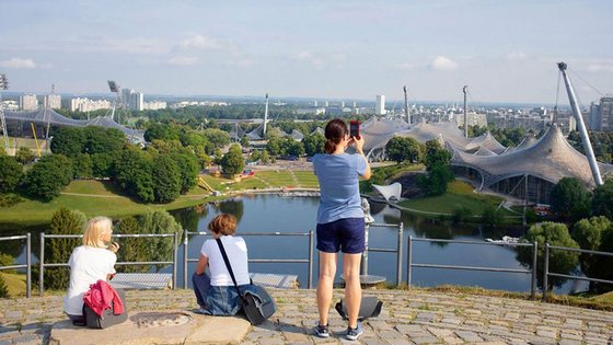 Doch auch unbeschwerte Aktivitäten wie Radtouren durch den Olympiapark oder Führungen über das spektakuläre Zeltdach des Olympiastadions, vor dem wir jetzt stehen, sind geplant. Bereits 2006, erinnert Christiane Haack, hat der FC Bayern seine Spielstätte in die Allianz-Arena verlegt. Viele fürchteten damals, dass diese Entscheidung den Niedergang des Olympiaparks besiegeln würde, weiß die Gästeführerin. „Doch er ist belebt geblieben, auch dank vieler Veranstaltungen wie etwa dem Tollwood-Festival“, freut sich Haack. Das wundert uns nicht. Schließlich ist der Olympiapark mit seinen Sportstätten nicht nur ein Anlaufpunkt für viele Aktive, sondern auch ein abwechslungsreiches Frischluftareal mit einem See und einer abwechslungsreichen Topografie. „Die Hügel wurden künstlich mit Kriegsschutt aufgehäuft“, erklärt unsere Gästeführerin, als wir den Olympiaberg erklommen haben. Ein komisches Gefühl, auf dem Boden sinnloser Zerstörung die tolle Aussicht zu genießen. Sie reicht von Schloss Nymphenburg im Westen über die Frauenkirche in der Altstadt bis zum Riesenrad am Ostbahnhof.
