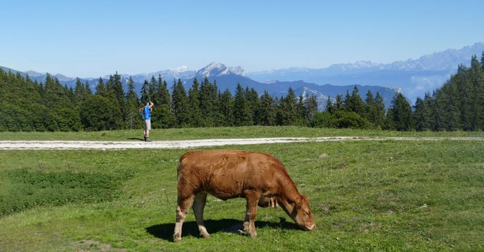 Doch natürlich offenbart sich der Charme dieses Wanderparadieses auch auf leichteren Runden. Ideal für den Einstieg ist etwa das Plateau de la Molière im Norden der Bergkette. Vom Wanderdorf Autrans aus lässt sich das Hochplateau mit dem Auto anfahren. „Deshalb und wegen der geringen Höhenunterschiede ist dieses Gebiet bei Familien sehr beliebt“, erklärt Wanderführer Etienne. Am Beginn des Weges zieht eine Aussichtsplattform die Besucher magisch an: Umgeben von weidenden Kühen auf grünen Wiesen blicken sie von hier bis zur Alpenkette mit dem Mont Blanc. Der aussichtsreiche Neun-Kilometer-Rundweg (Gehzeit ca. viereinhalb Stunden) verläuft zunächst in südlicher Richtung am Kamm entlang, wobei sich im Osten die umgebenden Berge und Grenoble mit der Isère erstrecken, im Westen die ebene Landschaft rund um Valence mit der Rhone. Nach einem kleinen Abstieg und einer Wende um 180 Grad geht es auf einem etwas tiefer liegenden Pfad vorbei an der Auberge Molière zurück zum Ausgangspunkt.