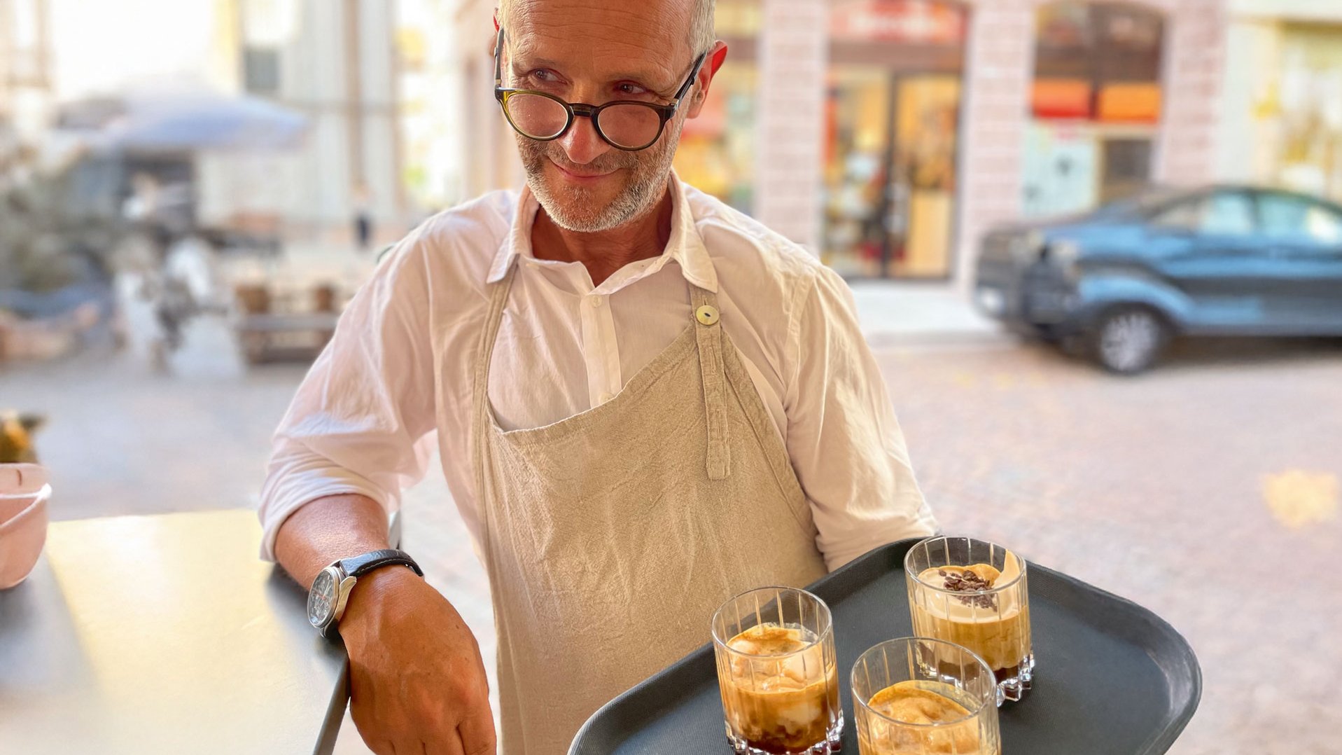„Manchmal ist der Name Programm“, sagt der Chef und stellt sich vor: Luca Torta, also Kuchen auf Deutsch. Und was empfiehlt er? „Ich lasse mich von den Menschen inspirieren!“ Wie ein guter Barkeeper. Wir sind zu dritt und bekommen: einen Kaffee mit Lakritz, einen mit Amarenawein und Mandelsirup, einen mit Kaffee-Eis. Selbstverständlich alle kalt.