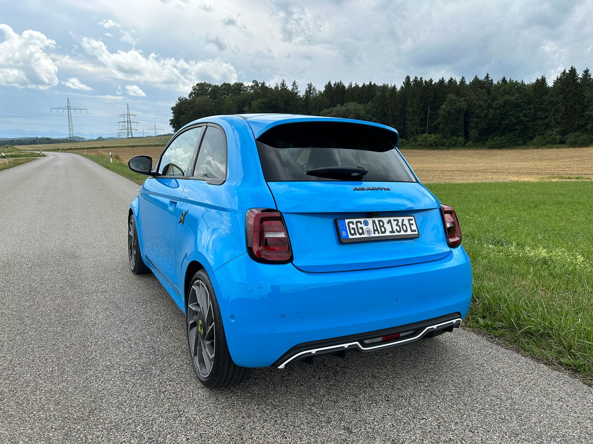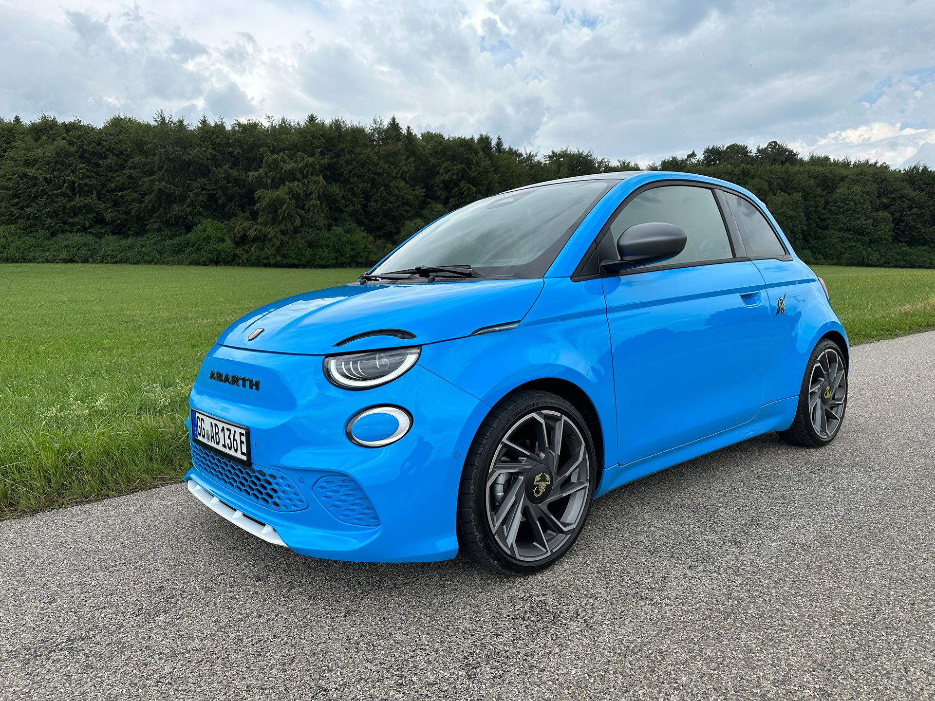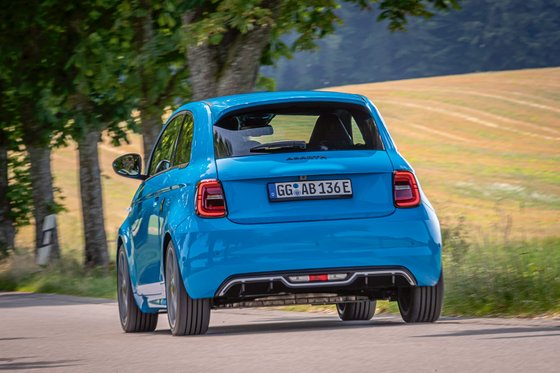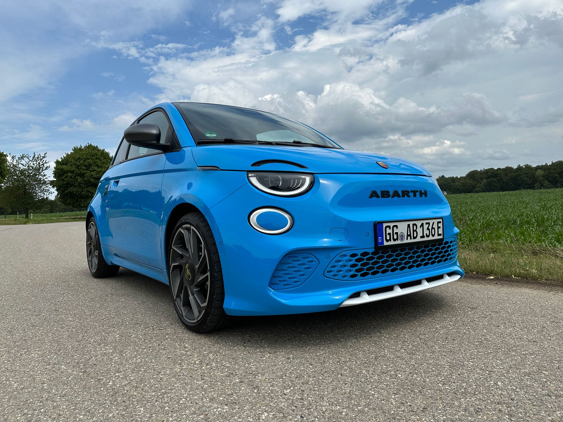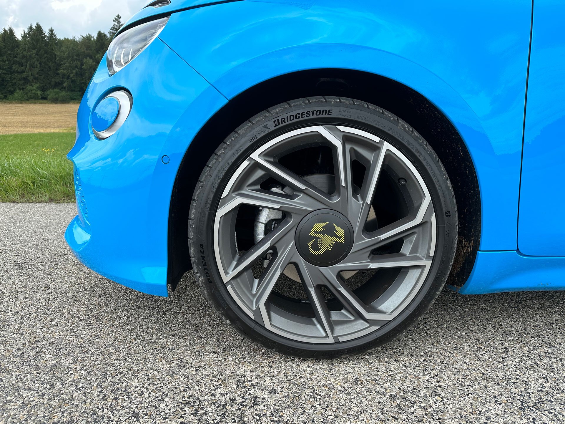 Nachprüfen konnten wir das nicht, als wir in der vollausgestatteten Top-Variante Turismo (42.990 Euro) unterwegs waren. Aber auf welligem Asphalt einsamer oberbayerischer Nebenstraßen klebte der in Poison Blue (700 Euro) gefärbte Renner förmlich an der Fahrbahn. Selbst bei zügiger Gangart blieb der Verbrauch mit unter 17 kWh laut Bordcomputer vergleichsweise moderat. Gut so, denn mit 253 Kilometern Reichweite nach WLTP kommt der Turismo auf seinen großen 18-Zoll-Rädern nicht allzu weit, ohne nachzuladen. Wer sich bei der flinken Fahrt frischen Wind im Cockpit wünscht, greift zur Cabrio-Variante. Für 3.000 Euro Aufpreis gibt es den Abarth 500e auch mit zurückschiebbarem Stoffdach zwischen den Dachholmen.
