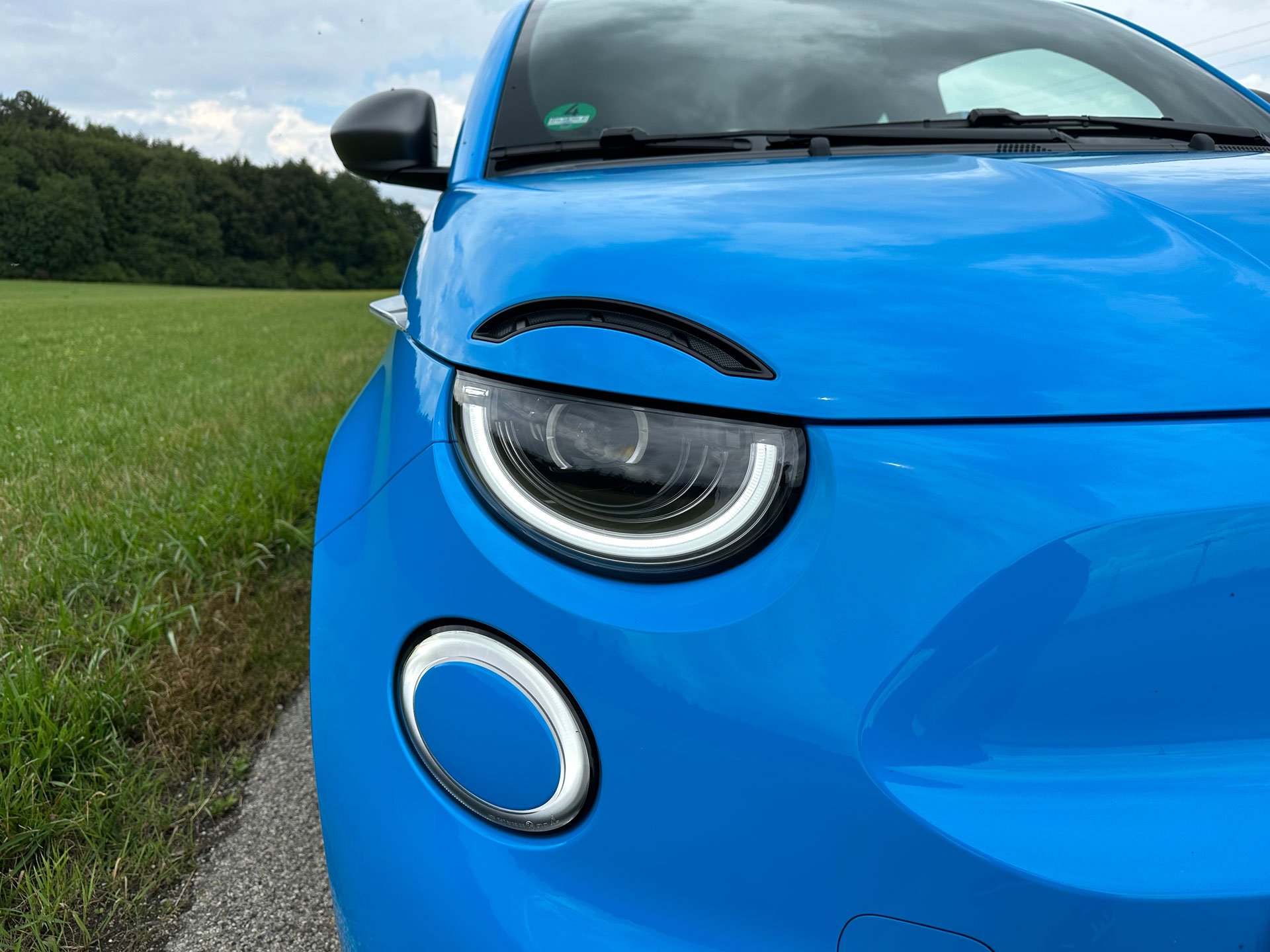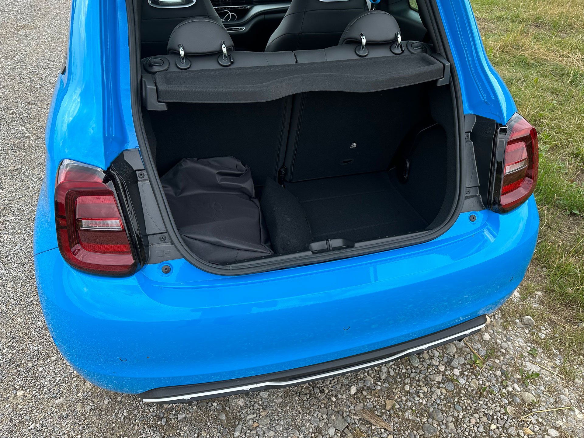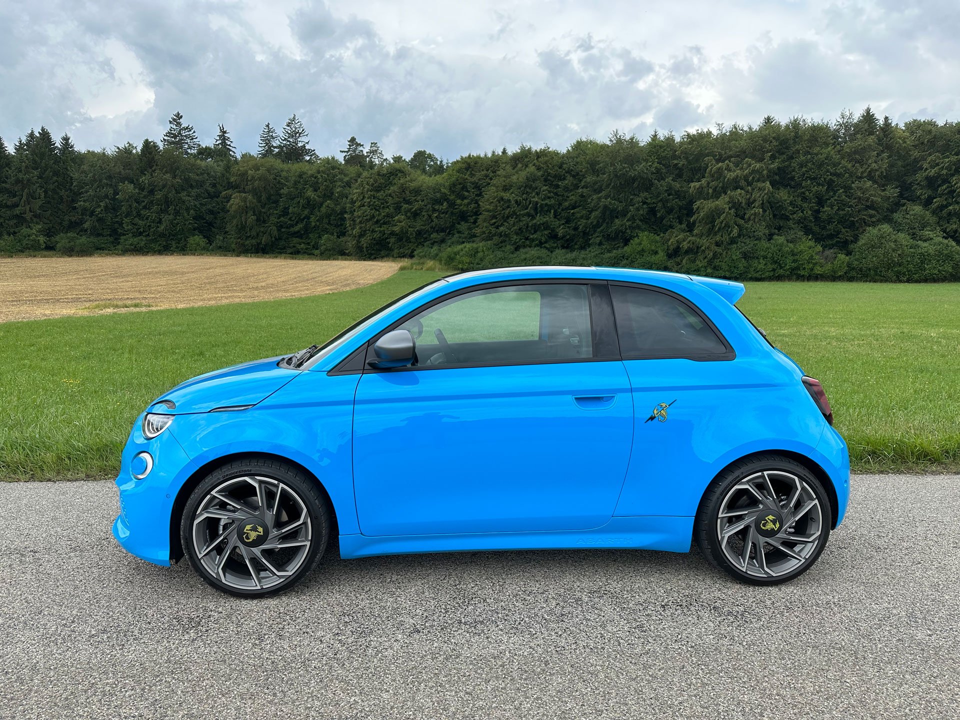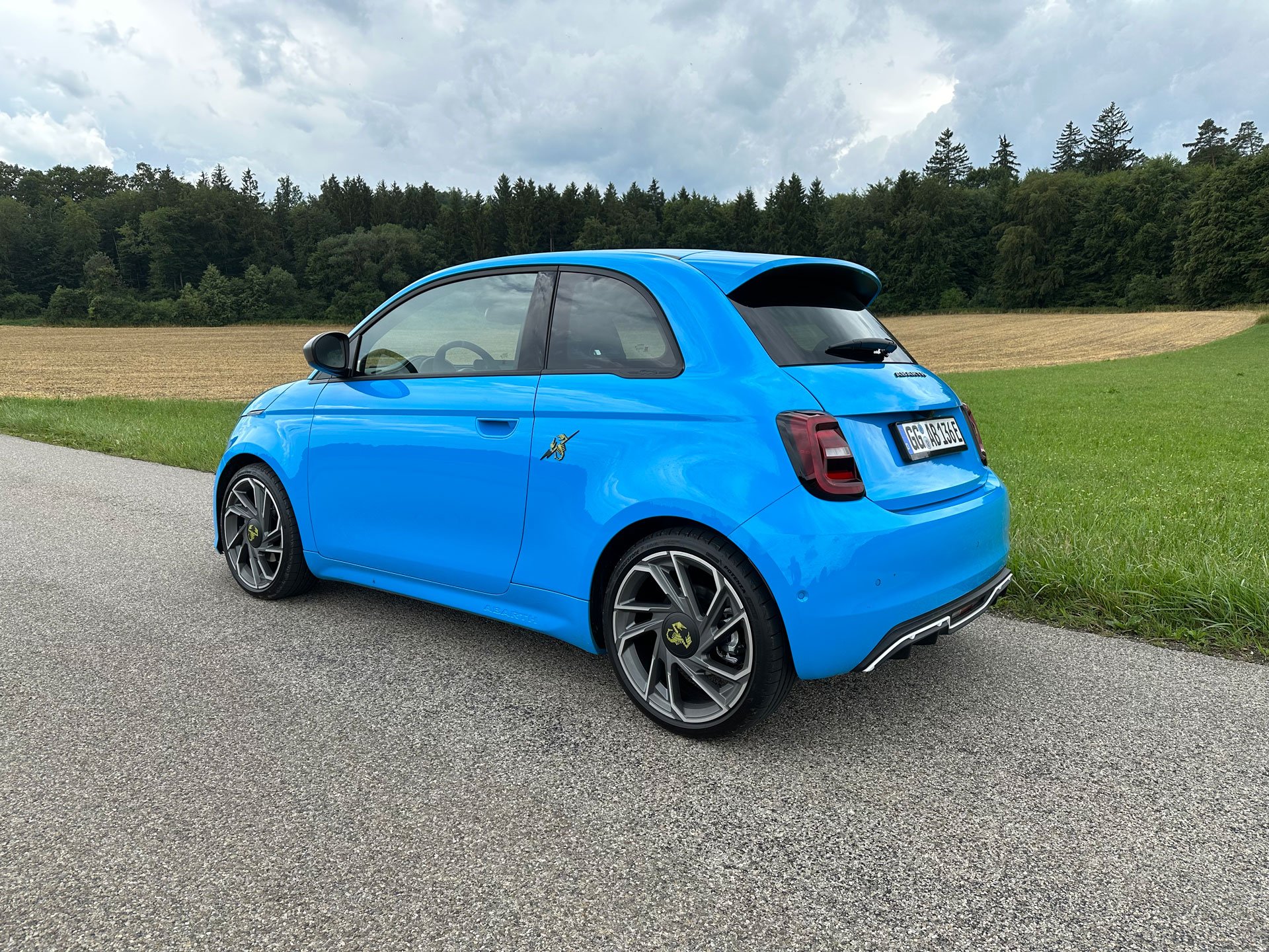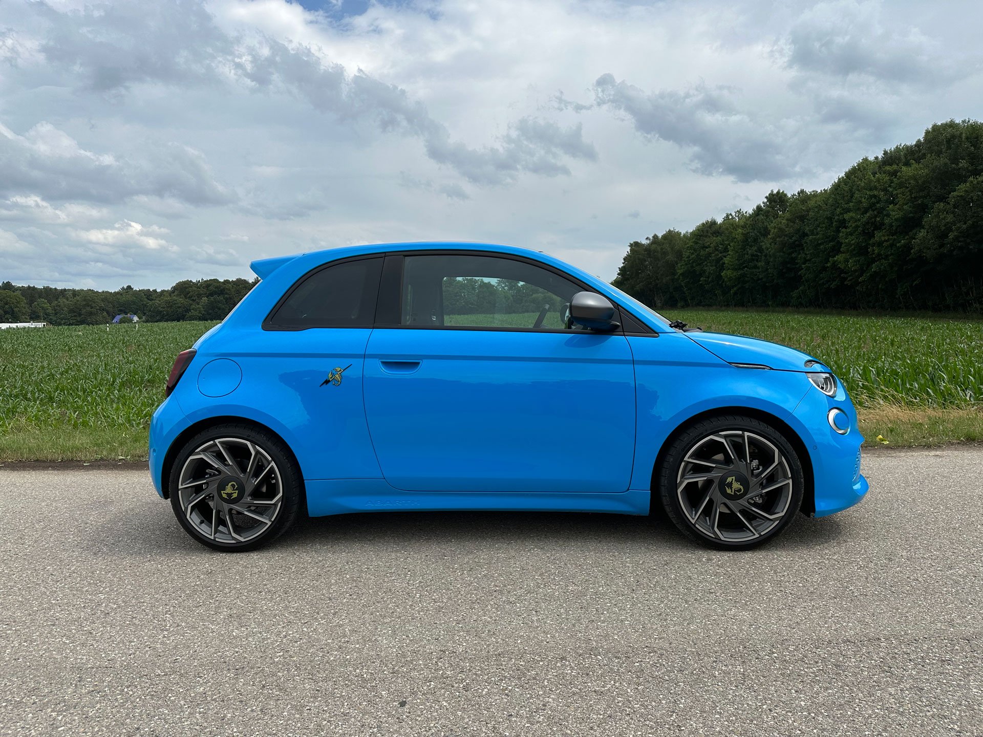 Nachprüfen konnten wir das nicht, als wir in der vollausgestatteten Top-Variante Turismo (42.990 Euro) unterwegs waren. Aber auf welligem Asphalt einsamer oberbayerischer Nebenstraßen klebte der in Poison Blue (700 Euro) gefärbte Renner förmlich an der Fahrbahn. Selbst bei zügiger Gangart blieb der Verbrauch mit unter 17 kWh laut Bordcomputer vergleichsweise moderat. Gut so, denn mit 253 Kilometern Reichweite nach WLTP kommt der Turismo auf seinen großen 18-Zoll-Rädern nicht allzu weit, ohne nachzuladen. Wer sich bei der flinken Fahrt frischen Wind im Cockpit wünscht, greift zur Cabrio-Variante. Für 3.000 Euro Aufpreis gibt es den Abarth 500e auch mit zurückschiebbarem Stoffdach zwischen den Dachholmen.
