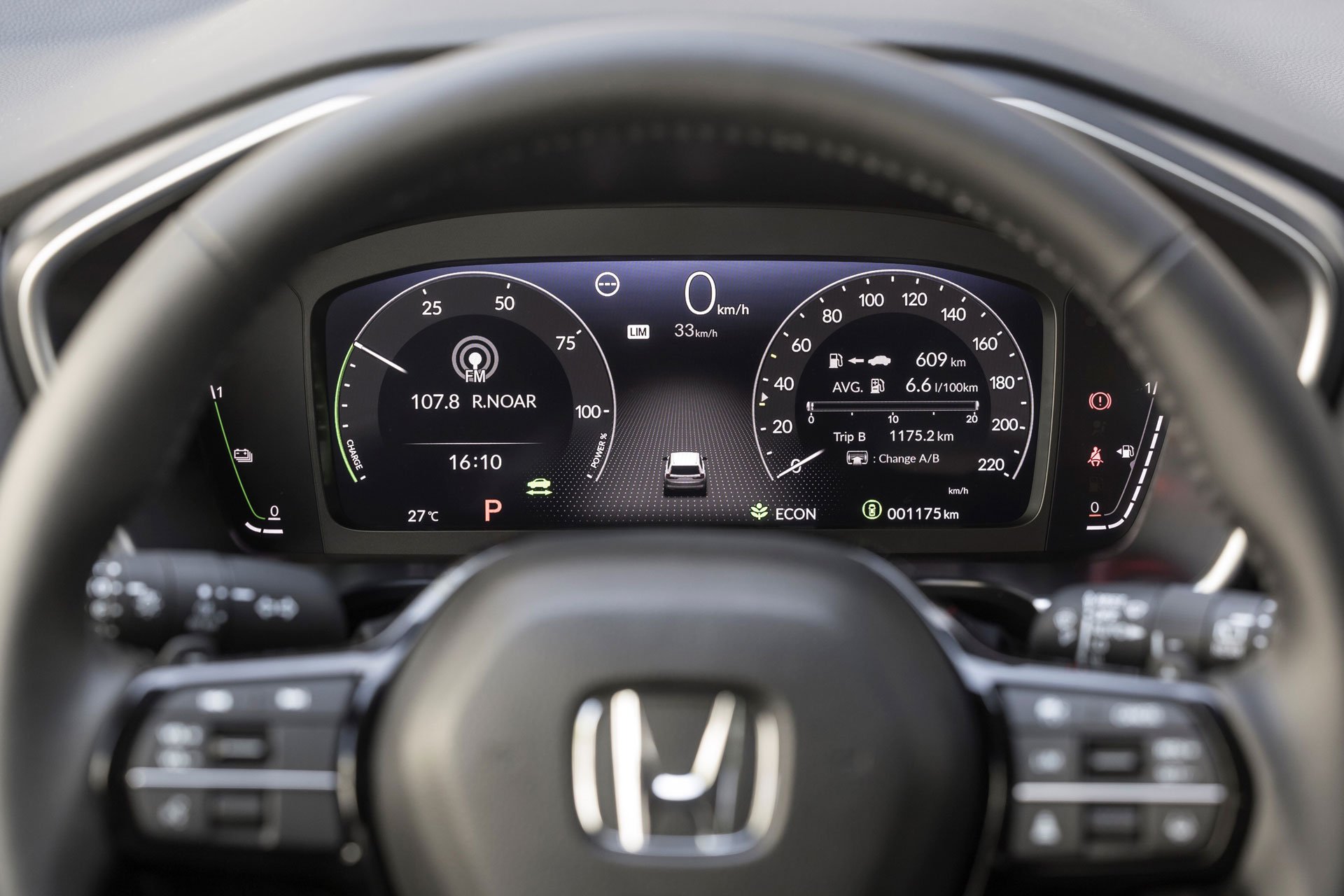 Als e:HEV ist der CR-V in den beiden Ausstattungsvarianten Elegance (ab 51.400 Euro) und Advance (ab 54.900 Euro) erhältlich. Bestandteil der Basisversion ist das von Honda Sensing 360 genannte Sicherheitspaket, das etwa tote Winkel rund um das Fahrzeug ausmerzen soll. Erstmals erhältlich ist ein vorderer Ausparkassistent, der die Unfallgefahr beim Einfahren in schlecht einsehbare Kreuzungen verringern soll. Europa-Premiere feiert die weiterentwickelte Verkehrszeichenerkennung, die etwa nahende Stopp-Schilder erkennt, damit sich der Fahrer auf die neue Situation vorbereiten kann. Überdies gibt es Voll-LED-Scheinwerfer, Einparkhilfe und Querverkehrswarner vorn und hinten, Rückfahrkamera, Tempomat, Spurhalte-, Spurwechsel- sowie Kurvenassistent mit Bremseingriff.