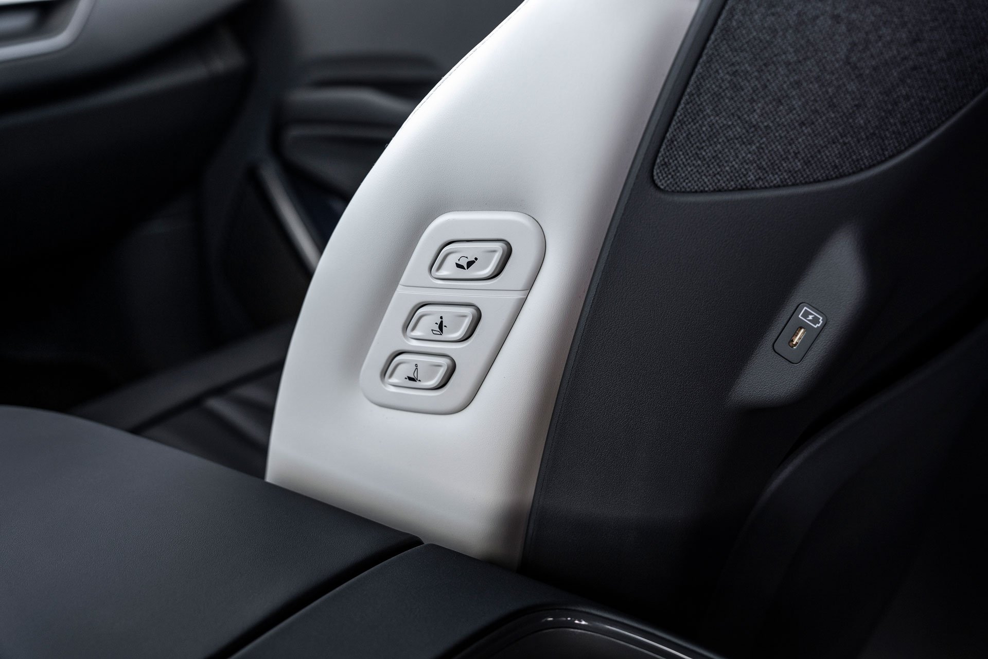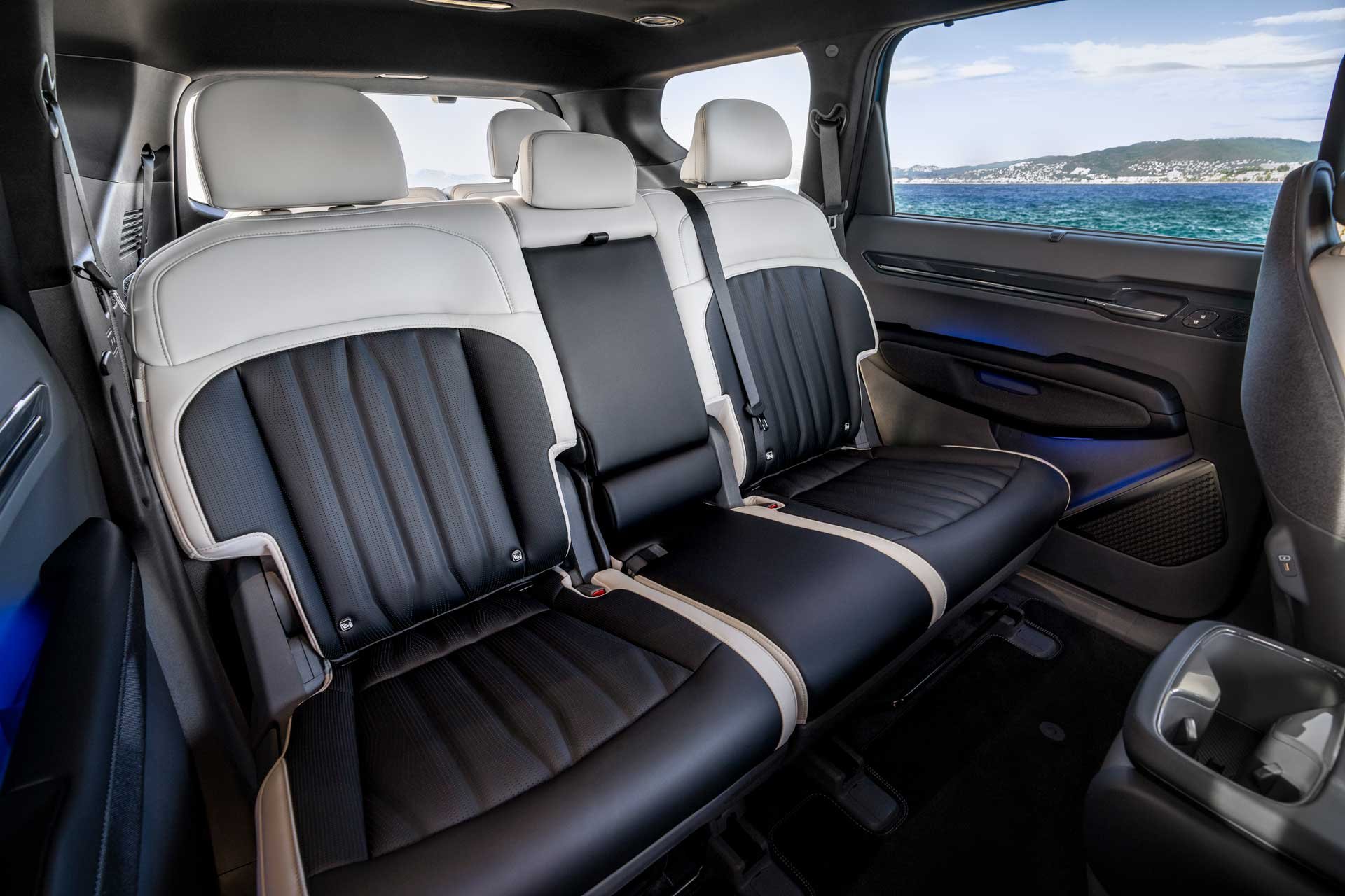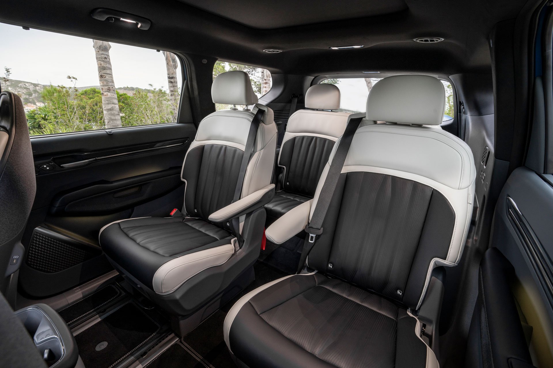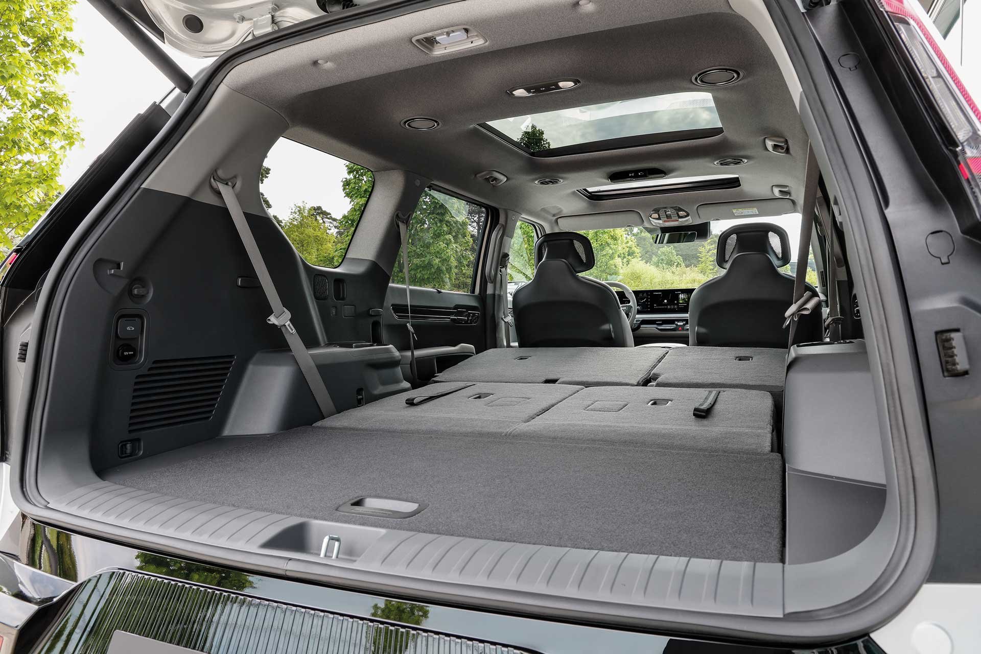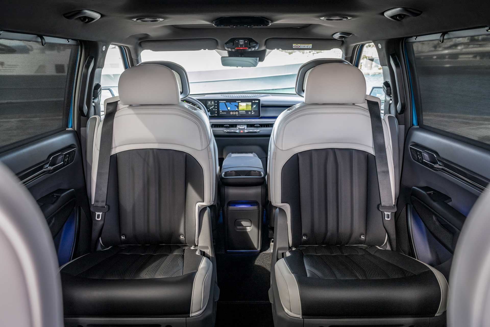 Serienmäßig mit sieben Sitzen in drei Sitzreihen, gibt es den EV9 in der Ausstattungsstufe GT-Line auch als Sechssitzer. Statt auf der Rückbank sitzen die Fahrgäste in der zweiten Reihe gegen Aufpreis (990 Euro im Paket) dann auf zwei Einzelsitzen, die sich um 90 Grad zur geöffneten Tür und um 180 Grad zur dritten Sitzreihe manuell schwenken lassen. Ist diese gleichfalls besetzt, ist die Beinfreiheit allerdings knapp bemessen. Bei aufrechter Position aller Sitzlehnen müssen sich die Insassen bei einem Kofferraumvolumen von 333 Litern in der Gepäckauswahl ziemlich einschränken. Erst wenn die Lehnen der dritten Reihe umgeklappt werden, stehen alltagstaugliche 828 Liter (Sechssitzer) und bei umgeklappten Lehnen der zweiten und dritten Sitzreihe bis zu 2.393 Liter zur Verfügung.
