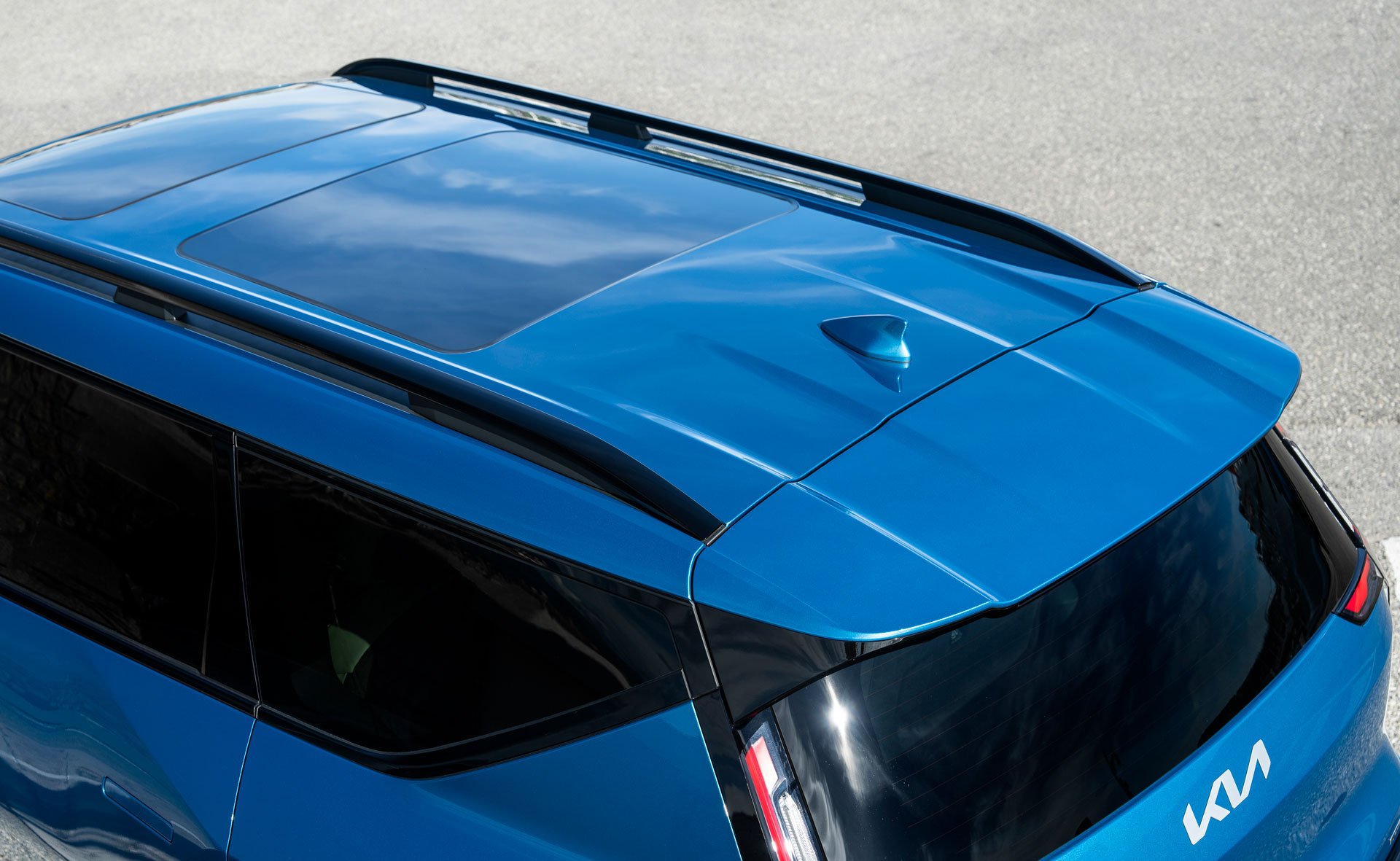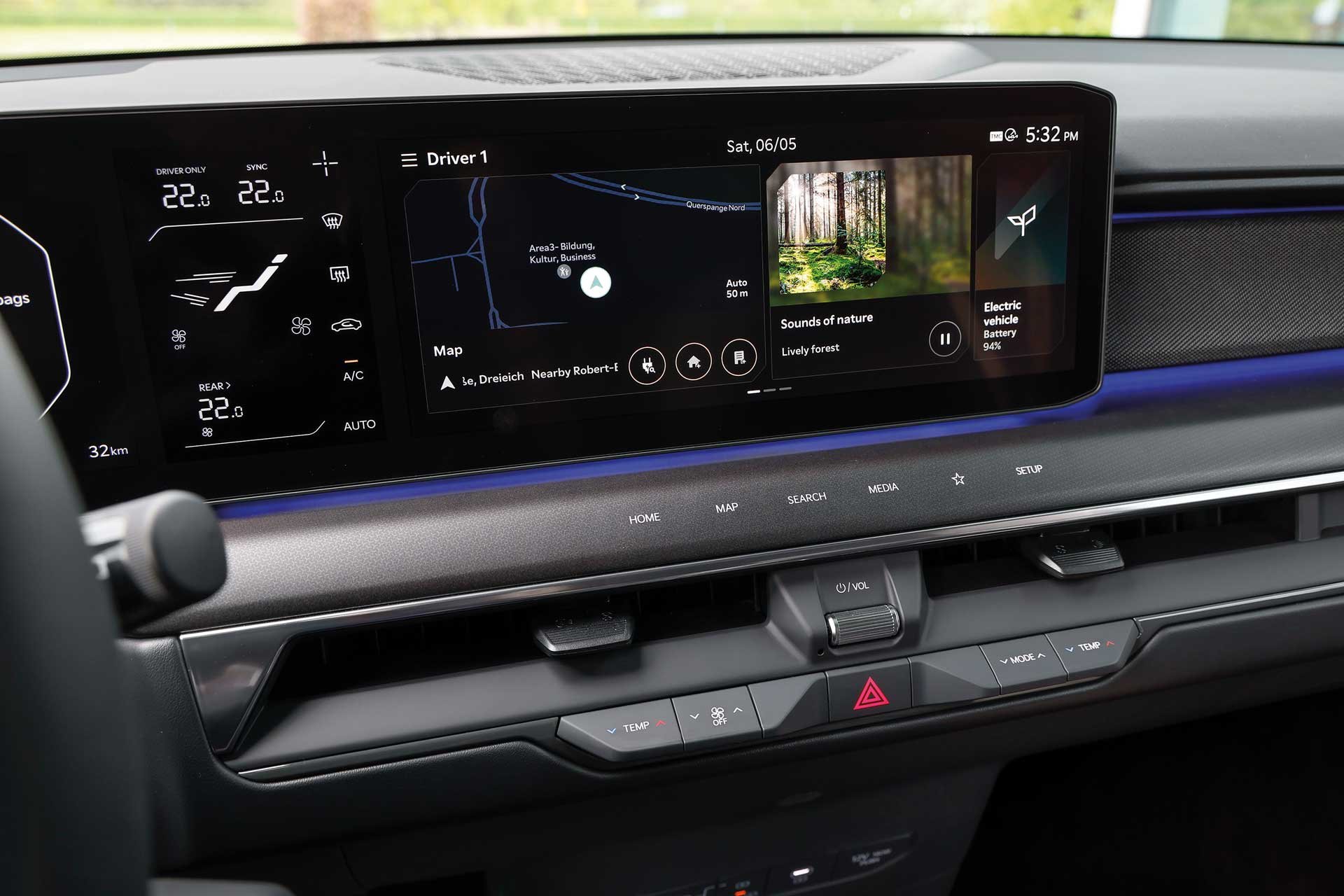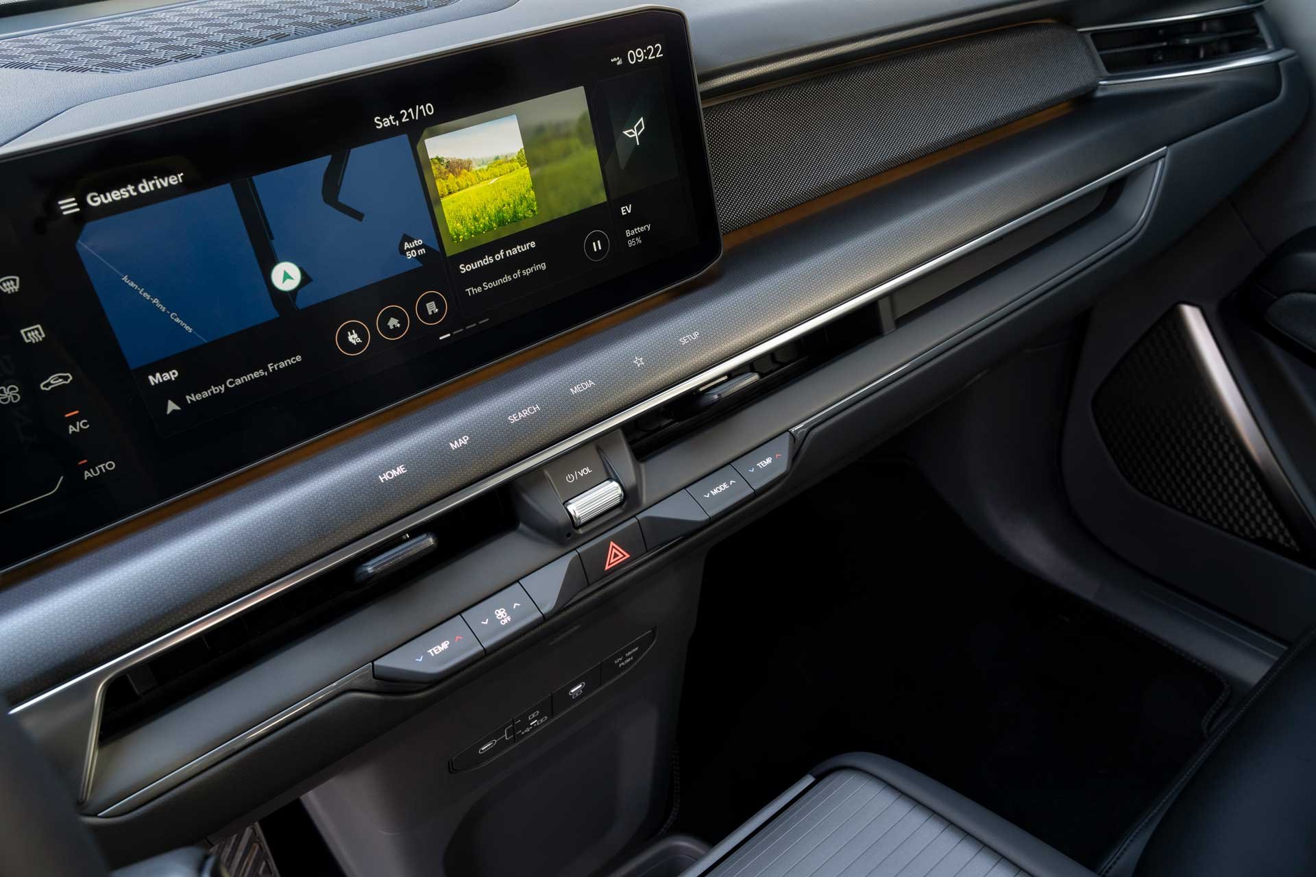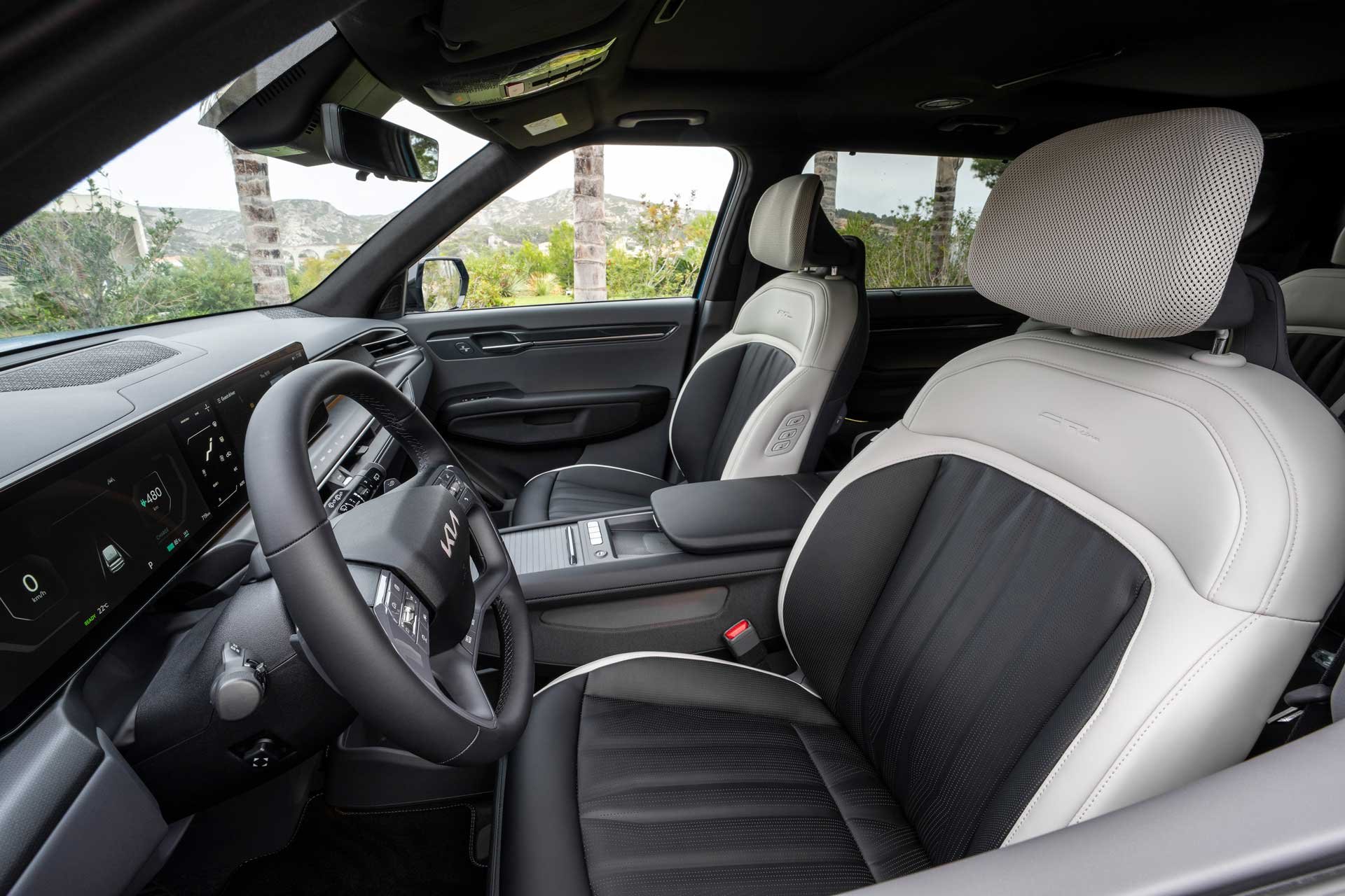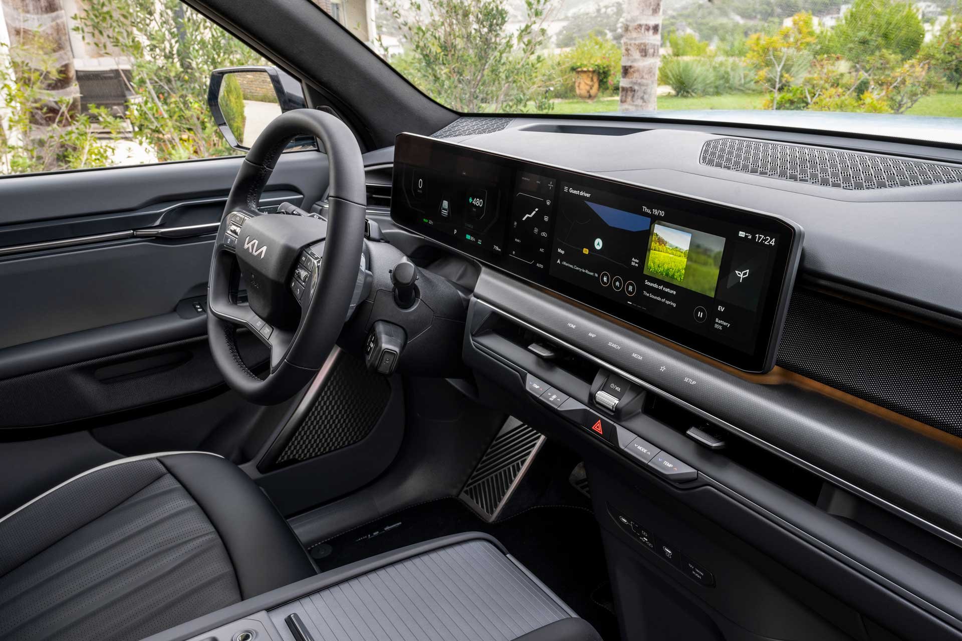 Inklusive Außenspiegel kommt der EV9 auf eine stattliche Breite von 2,26 Metern und dürfte damit in Autobahnbaustellen wohl oft mit der rechten Fahrspur vorliebnehmen müssen. Gegen Aufpreis (1.190 Euro) sind in der höchsten Ausstattungsstufe GT-Line auch grazilere digitale Außenspiegel erhältlich, mit denen sich die Fahrzeugbreite um 13 Zentimeter verringern lässt. Das Bild der Außenkameras wird dabei im Innenraum auf zwei Monitoren an den Türen angezeigt.
