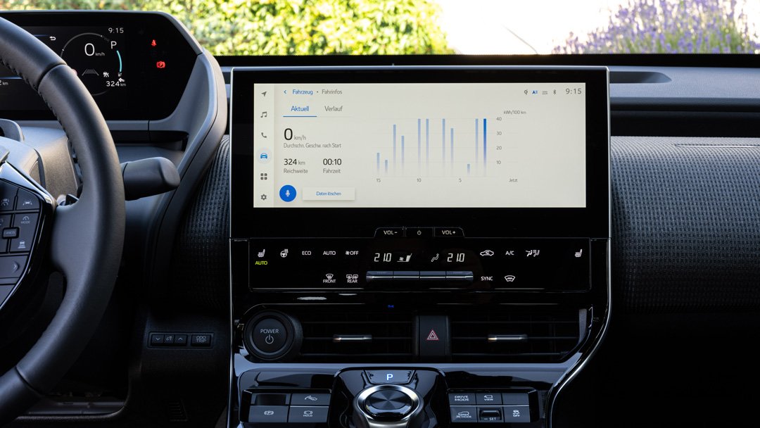 Ab Tempo 160 regelt das System zugunsten der Reichweite ab, die für das Basismodell laut WLTP-Messung mit 466 Kilometer angegeben wird. Setzt man hier ein realitätsnahes, moderates Fahren an, sind es bei voller 71,4-kWh-Batterie jedoch nicht mehr als gut 300 Kilometer. Somit hat uns auf einer ersten Testfahrt im topausgestatteten Solterra über 80 Kilometer auf allen Straßenkategorien der Verbrauch von 25 kWh/100 km nicht gewundert – deutlich über der WLTP-Norm von 17,9 kWh (CO2: 75 g/km*). In puncto Ladezeit darf man mit angekündigten Software-Updates auf Verbesserung hoffen, die angegebenen 30 Minuten für 80 Prozent Akkustand am 150-kW-Gleichstrom-Lader sind derzeit (Stand: Mai 2023) nicht zu erreichen (Laden AC: max. 7 kW).