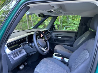 Vom Fahrerplatz aus betrachtet glänzt der ID.Buzz mit alten VW-Bus-Tugenden: erhöhte Sitzposition für tolle Übersicht und hervorragender Rundumblick – dank üppiger Scheiben sowie A-Säulen aus je zwei filigranen Streben mit großer Fensterfläche dazwischen. Nur die weit nach hinten gerückte Position der Vordersitze erinnert mehr an einen Van als an einen Bus. Zwischen Lenkrad und Frontscheibe liegt viel Armaturenbrett und in der Poleposition an der Ampel lassen sich die Lichtzeichen wegen der tiefen vorderen Dachkante nur mit Verrenkungen ablesen.