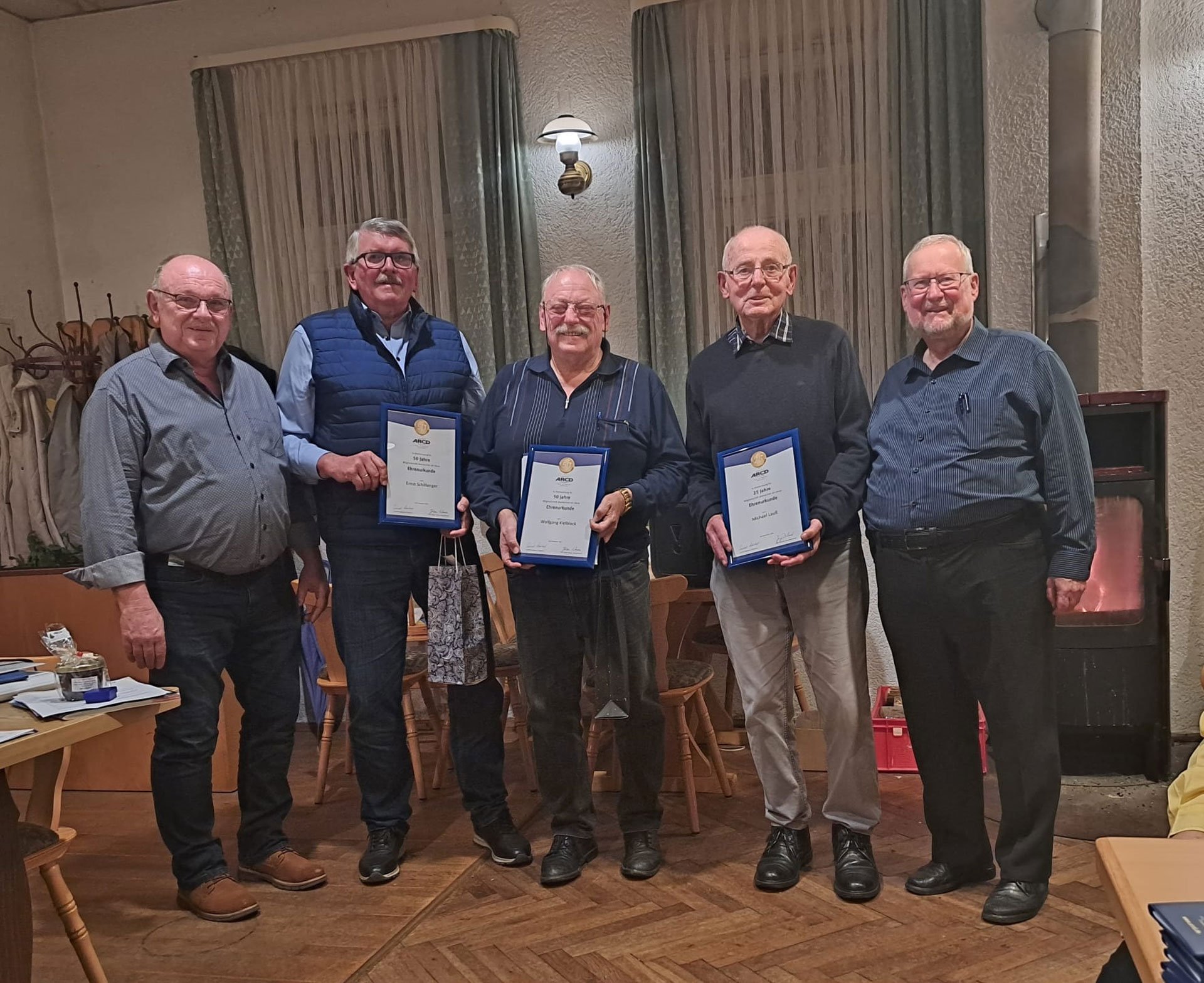 Das Bild von Marion Pöllath zeigt v.l.n.r. Landesvorsitzenden Anton Pöllath, Ernst Schillberger und stellv. OC Vorsitzenden Wolfgang Kielblock, die für 50 Jahre Treue zum ARCD geehrt wurden, sowie Michael Lauß (25 Jahre) und OC Vorsitzenden Claus Müller.