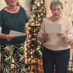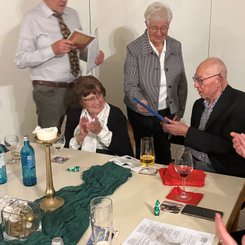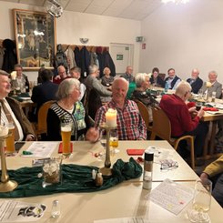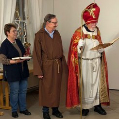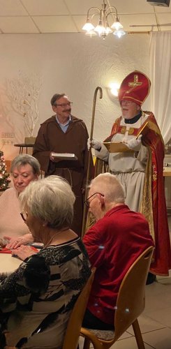 Als der heilige Nikolaus aus Mainz persönlich erschien, war die Überraschung groß. Da ließ es sich der Landesvorsitzende Jürgen Jeuck nicht nehmen, ihn als Knecht Ruprecht bei der Bescherung zusammen mit seiner Frau zu unterstützen. Alle Anwesenden erhielten die am Abend zuvor von den beiden Vorstandsmitgliedern Anne Scherer und Wolfgang Reif in liebevoller Handarbeit gefertigten Gaben.